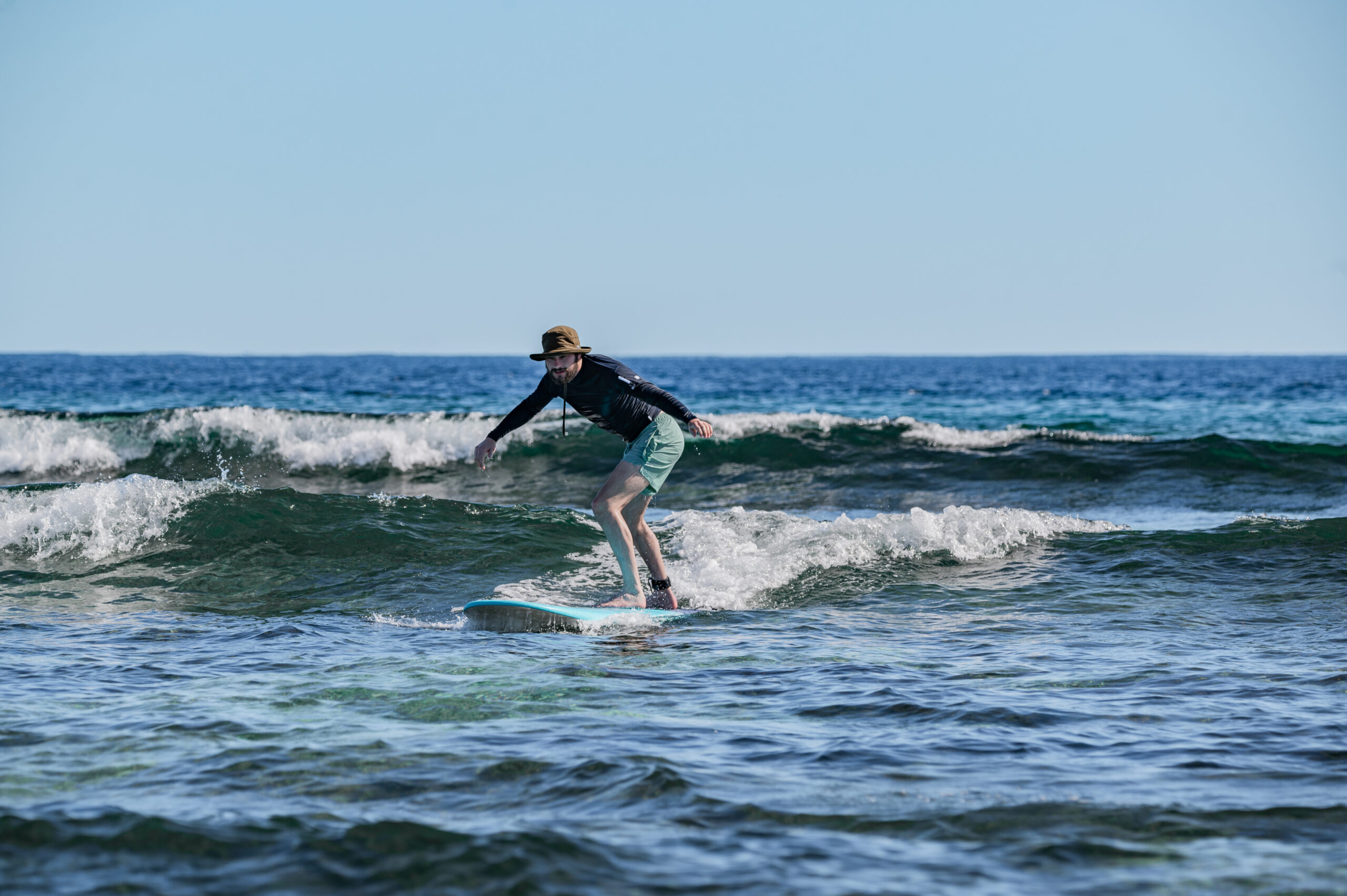Just a quick paddle out from the Beach Bar, our two-hour lessons on the house reef allow you to perfect your skills on long, rolling waves. This setting is ideal for beginner and intermediate surfers to learn and improve in a relaxed environment.